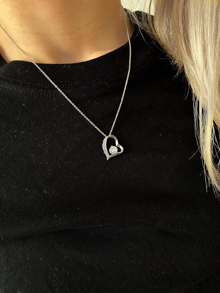 Ce collier étincelant dispose d'un pendentif en forme de cœur poli, qui encercle un zirconia de 6,5 mm impeccable, orné de petits cristaux qui ajoutent un éclat supplémentaire.