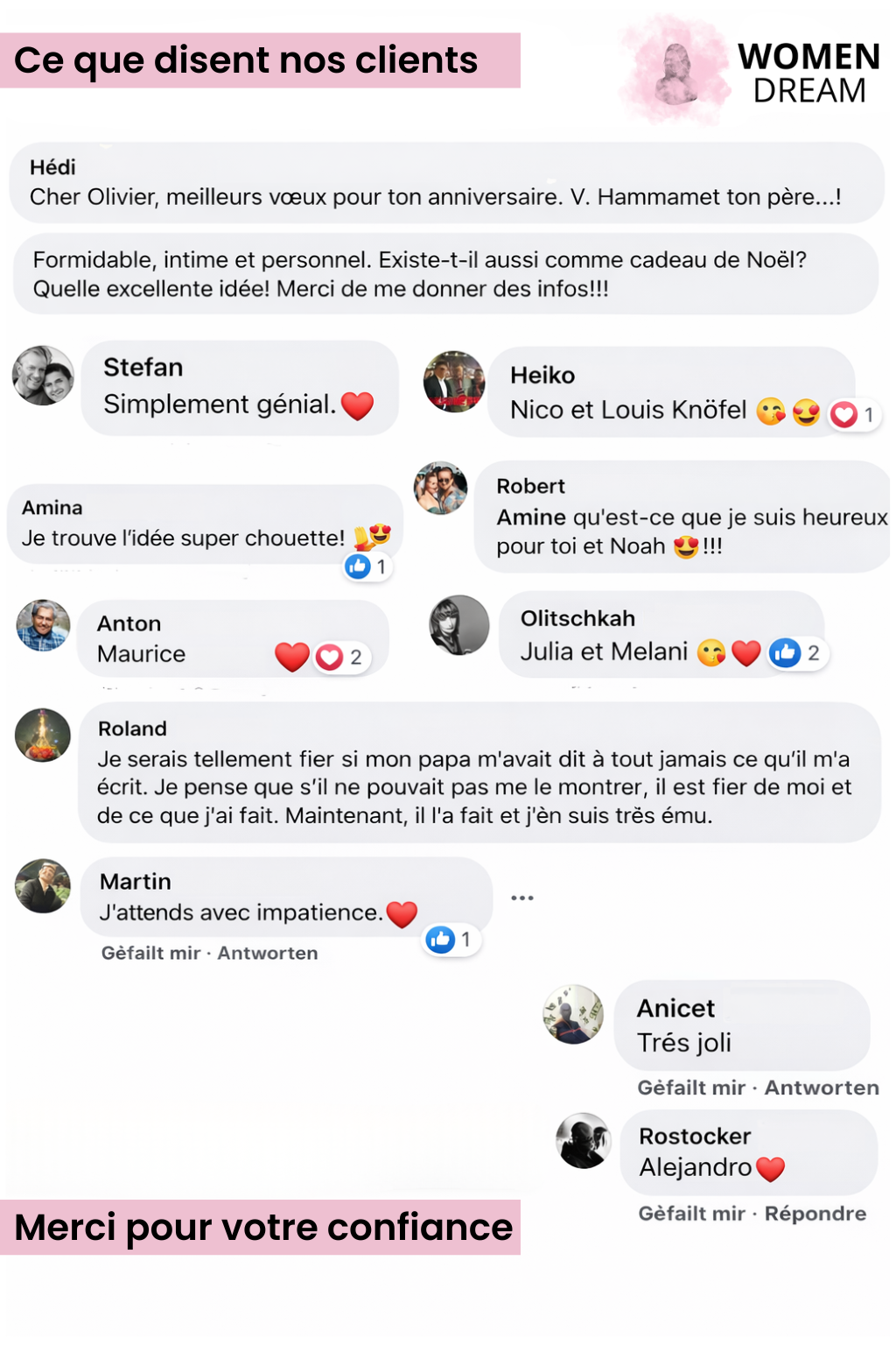 Avec Women Dream, vous pouvez montrer à vos proches combien vous tenez à eux. Nous espérons répandre plus d’amour dans le monde à travers nos bijoux. Toutes les commandes sont fabriquées à la main avec amour.